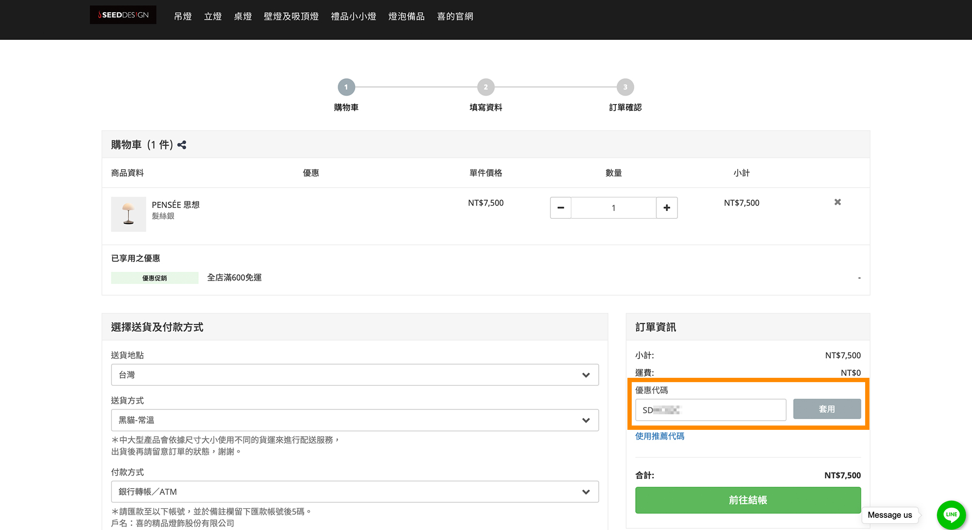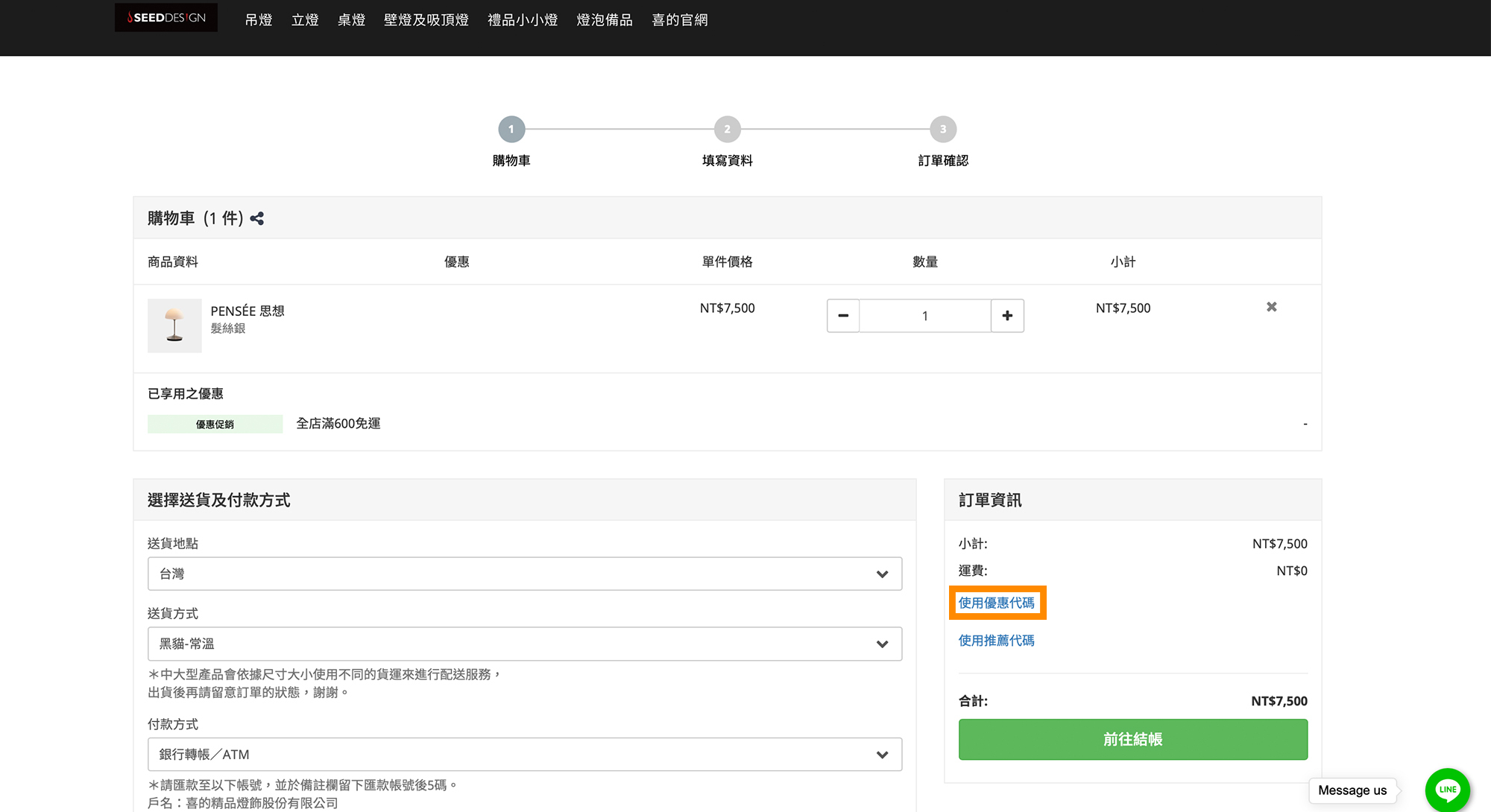 進入購物車結帳頁面,點選「使用優惠代碼」。