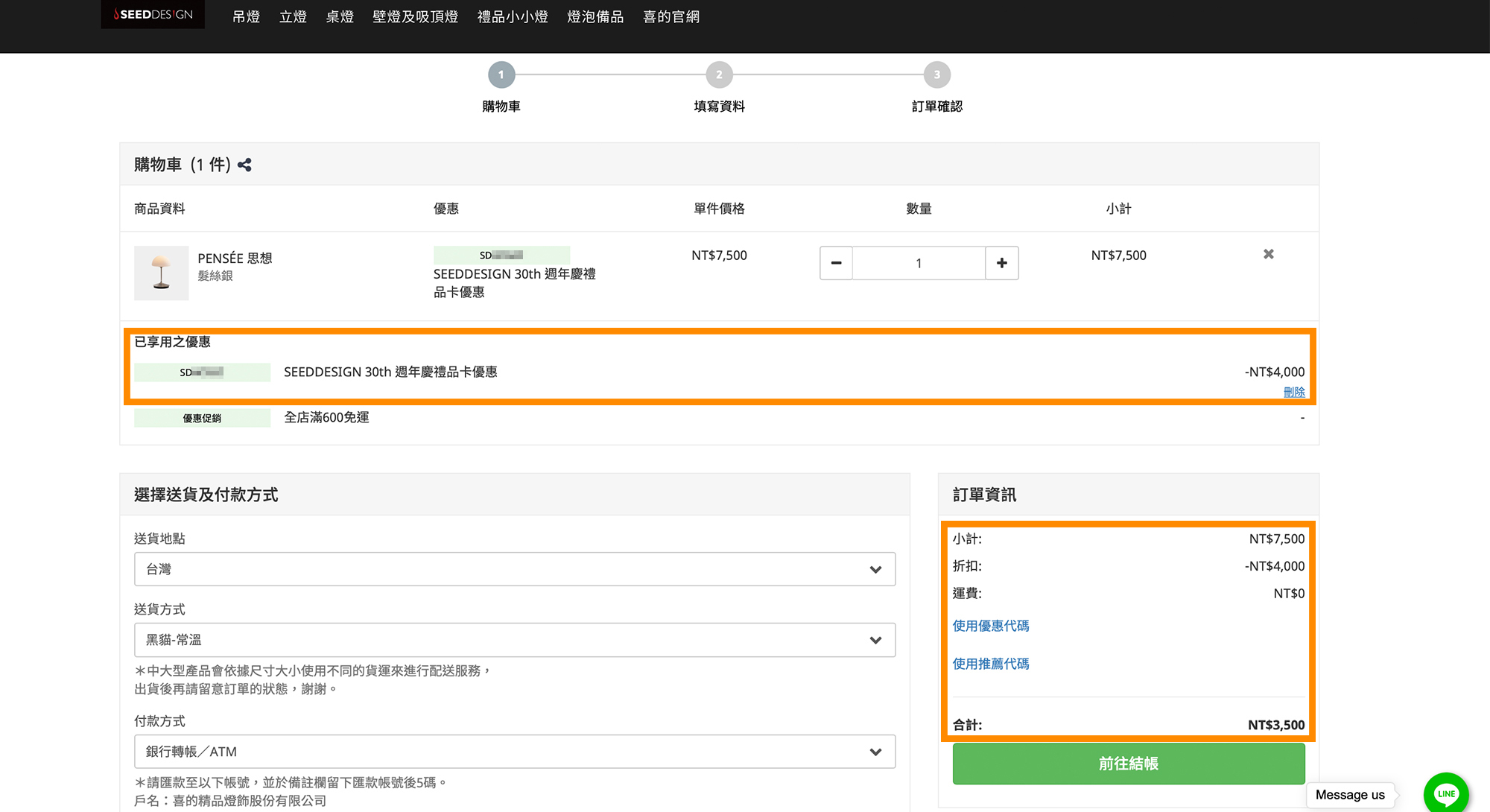 代碼帶入後,將扣除禮品卡面額,如消費金額低於禮品卡面額,則會全額折抵。確認合計金額無誤後,點擊「前往結帳」。
