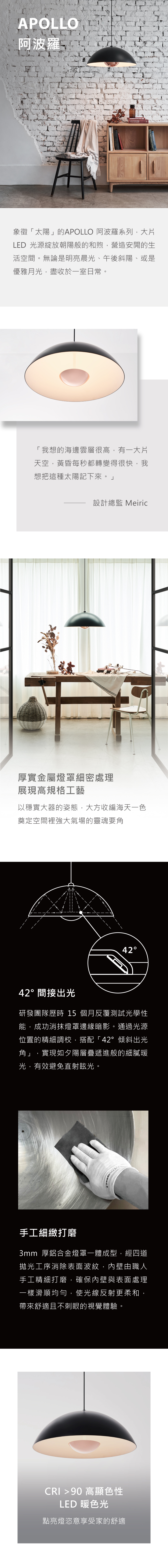 象徵「太陽」的 APOLLO 阿波羅吊燈系列,大片 LED 光源綻放朝陽般的和煦,營造安閒的生活空間。無論是明亮晨光、午後斜陽、或是優雅月光,盡收於一室日常。