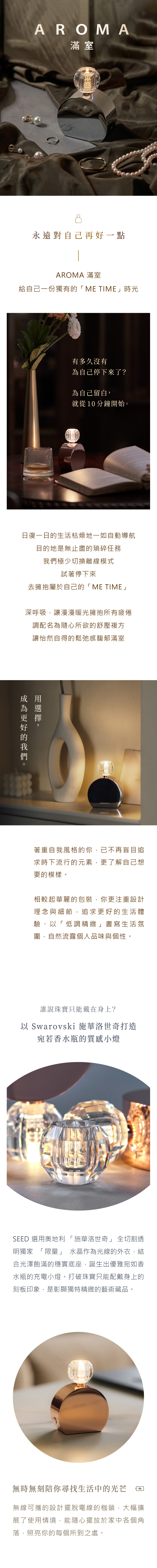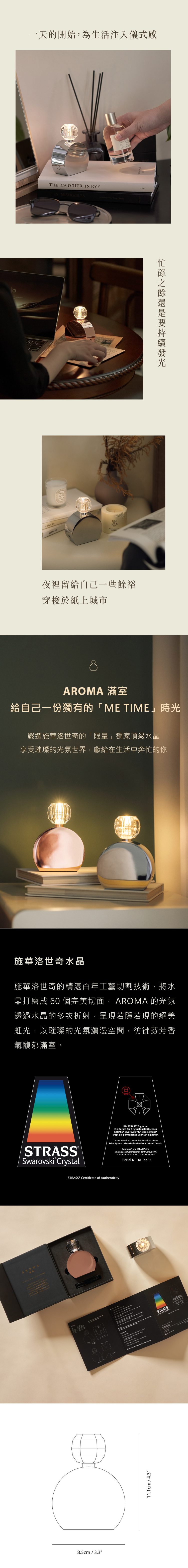 外型精巧優雅猶如香水瓶的充電小燈—結合奧地利「施華洛世奇」全切割透明水晶作為光線的外衣,與光澤飽滿的穩實底座,Aroma璀璨的光氛瀰漫空間,彷彿芬芳香氣馥郁滿室,於屋中一隅綻放耀眼光芒,自然營造令人醺然迷醉、愉悅宜人的光影世界。
