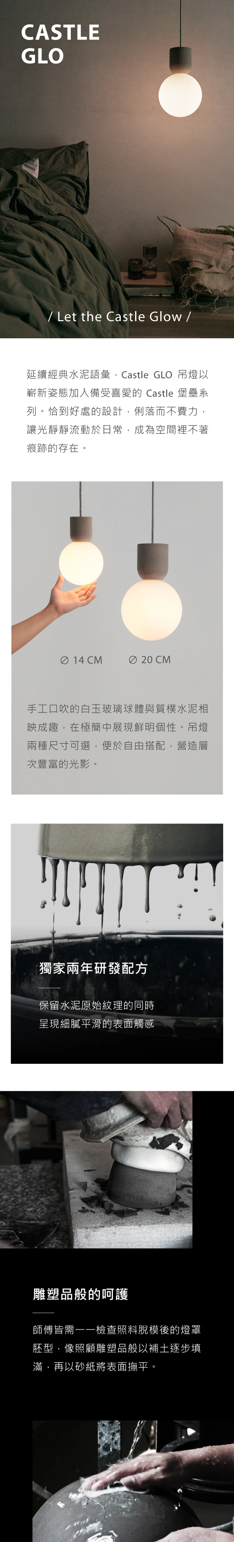延續經典水泥語彙,Castle GLO 吊燈以嶄新姿態加入備受喜愛的 Castle 堡壘系列。手工口吹的白玉玻璃球體與質樸水泥相映成趣,在極簡中展現鮮明個性。粗獷與細緻並存,無論復古寓所或都會小宅,Castle GLO 都能自然融入其中。恰到好處的設計,俐落而不費力,讓光靜靜流動於日常,成為空間裡不著痕跡的存在。
