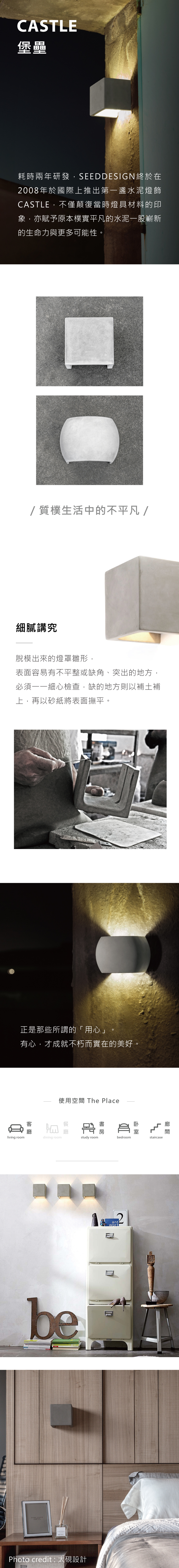 耗時兩年研發,終於在 2008 年成功推出國際上第一件水泥燈飾 CASTLE。保留水泥的原始紋理,同時呈現細緻觸感,並確保水泥的密合度及安全性適用於居家空間。CASTLE 不僅顛覆燈具材料的印象,亦賦予原本樸實平凡的水泥嶄新的生命力。