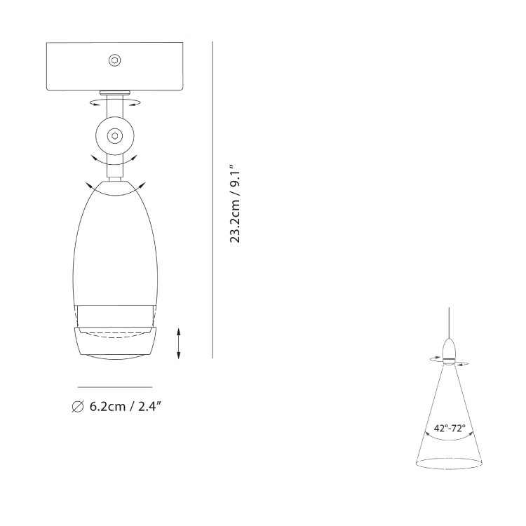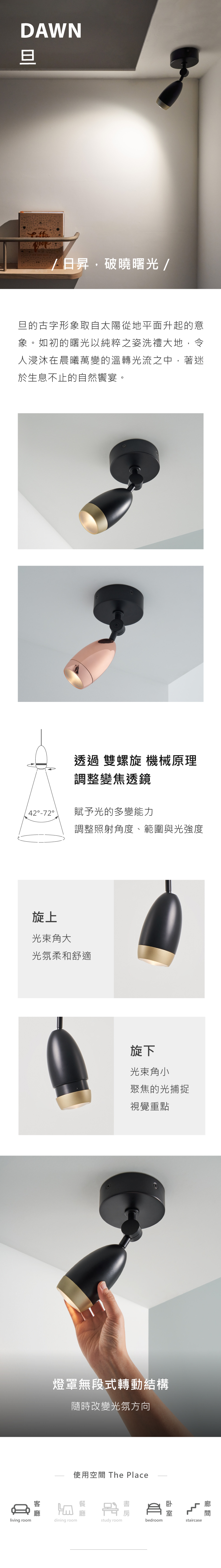 極簡乾淨的外型下藏有聰明的內涵,透過「雙螺旋」機械原理調整「變焦透鏡」,賦予光的多變能力:調整照射角度、範圍與光強度。優異的變焦功能適應多元使用情境,旋上:光束角大、光氛柔和舒適;旋下:光束角小、聚焦的光捕捉視覺重點。