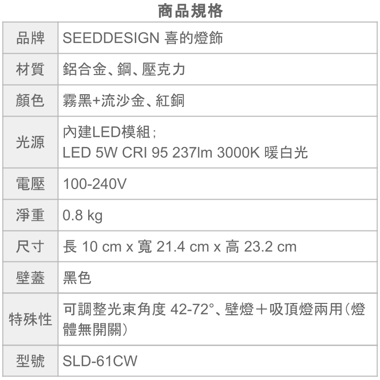 特殊性 可調整光束角度 42-72°、壁燈+吸頂燈兩用(燈體無開關)