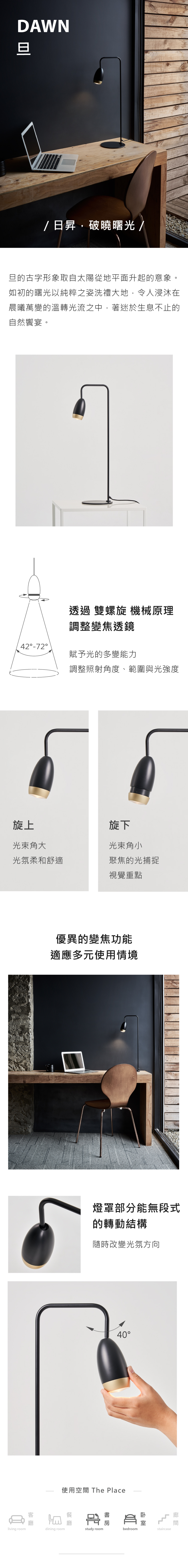 極簡乾淨的外型下藏有聰明的內涵,透過「雙螺旋」機械原理調整「變焦透鏡」,賦予光的多變能力:調整照射角度、範圍與光強度。優異的變焦功能適應多元使用情境,旋上:光束角大、光氛柔和舒適;旋下:光束角小、聚焦的光捕捉視覺重點。