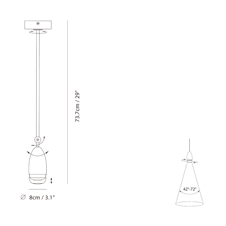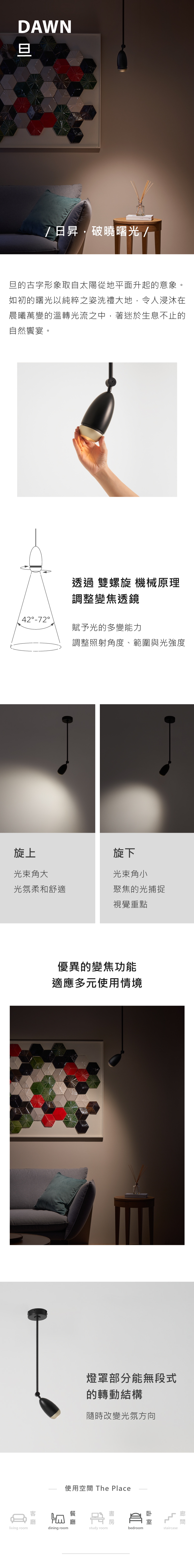 極簡乾淨的外型下藏有聰明的內涵,透過「雙螺旋」機械原理調整「變焦透鏡」,賦予光的多變能力:調整照射角度、範圍與光強度。優異的變焦功能適應多元使用情境,旋上:光束角大、光氛柔和舒適;旋下:光束角小、聚焦的光捕捉視覺重點。