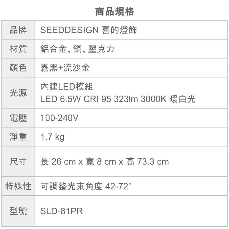 特殊性 可調整光束角度 42-72°
