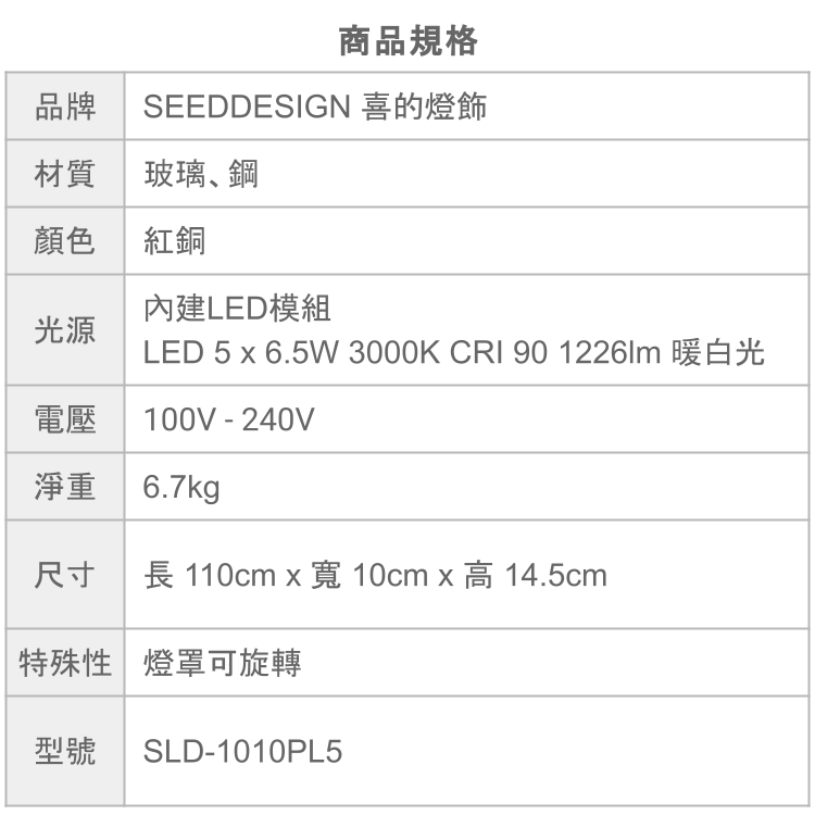 光源 LED 5 x 6.5W 3000K CRI 90 1226lm 暖白光