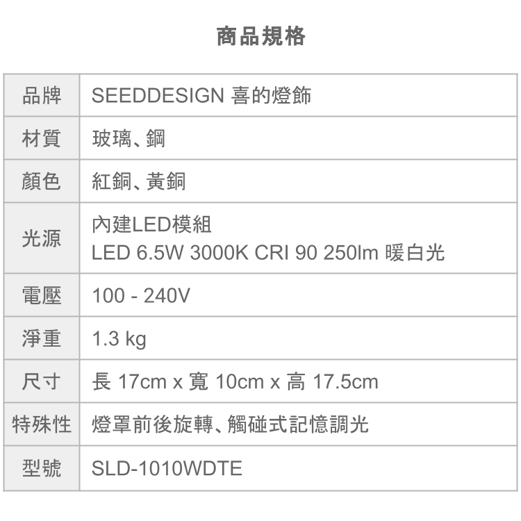 特殊性 燈罩前後旋轉、觸碰式記憶調光