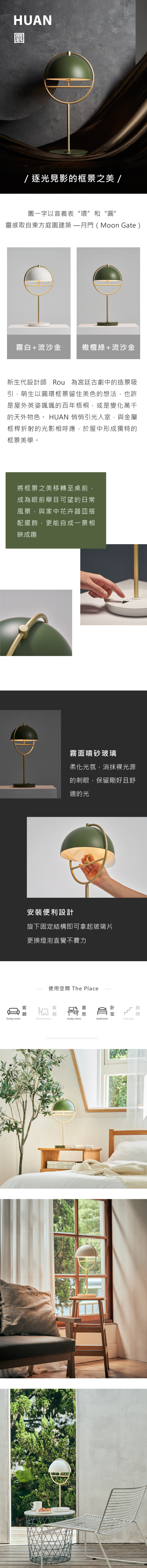靈感取自東方庭園建築 – 月門(Moon Gate)。新生代設計師Rou為宮廷古劇中的造景吸引,萌生以圓環框景留住美色的想法,也許是屋外英姿颯颯的百年梧桐,或是變化萬千的天外物色。HUAN悄悄引光入室,與金屬框桿折射的光影相呼應,於屋中形成獨特的框景美學。