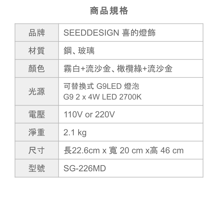 光源 可替換式 G9 LED 燈泡 2 x 4W LED 2700K 暖白光(隨燈附贈 )