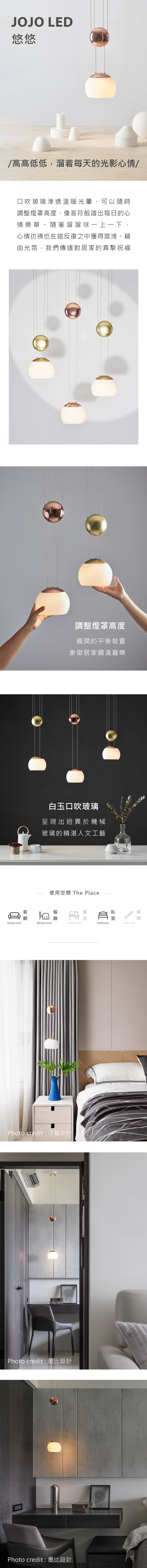 隨著溜溜球一上一下,心情彷彿也在這反覆之中獲得宣洩。JOJO的平衡裝置,可以讓你隨時調整燈罩高度,伴著口吹玻璃滲透出溫暖光暈,像音符般譜出每日的心情樂章。 新版 LED 吊燈還原設計師於1994 年設計初衷,上下兩抹圓潤象徵圓滿喜樂;藉由光氛,我們傳達對居家的真摯祝福。