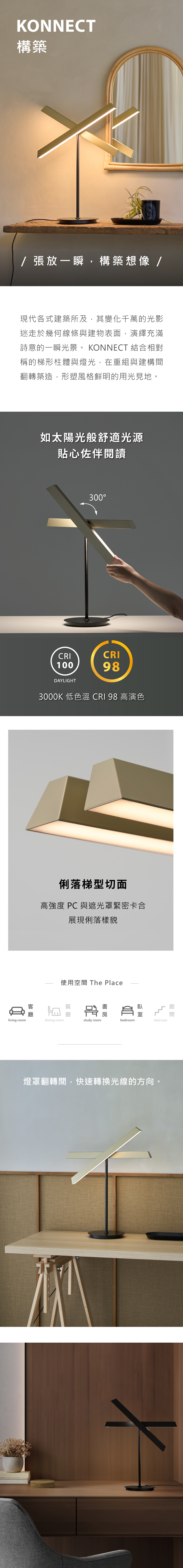 現代各式建築所及,其變化萬千的光影迷走於幾何線條與建物表面,於無聲流動中演繹充滿詩意的一瞬光景。一如KONNECT跳脫單一模式的思考方式,結合相對稱的梯形柱體與燈光,在重組與建構之間翻轉築造,形塑風格鮮明的用光見地。
