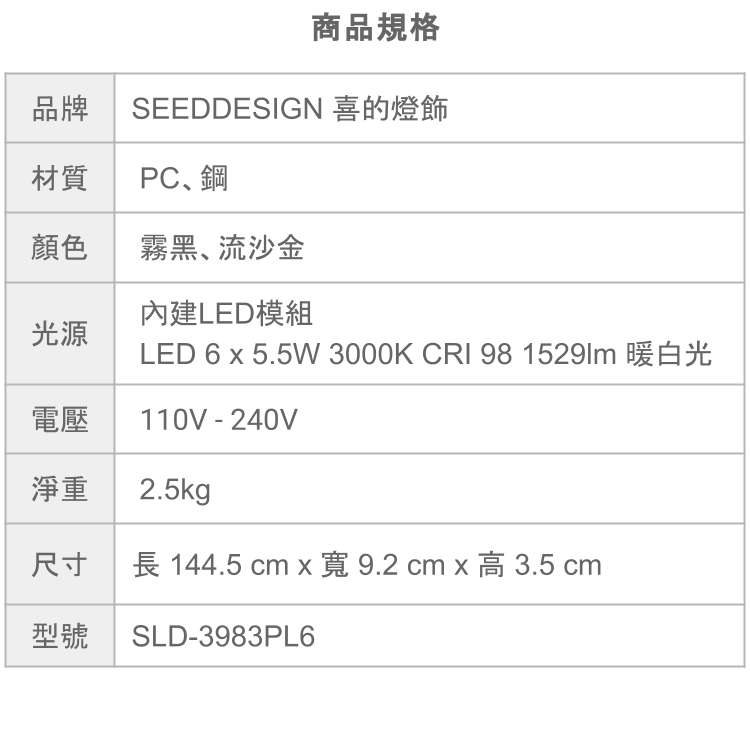 光源 LED 6 x 5.5W 3000K CRI 98 1529lm 暖白光
