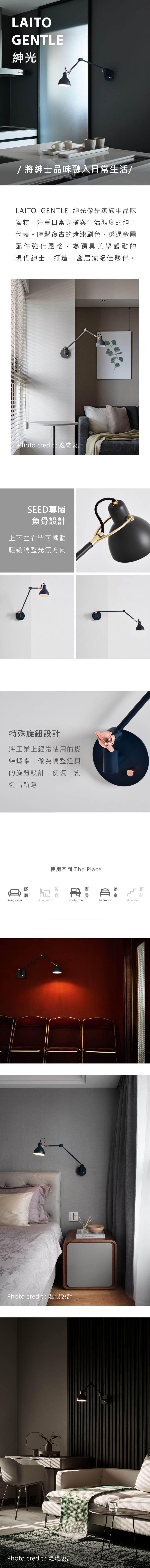 LAITO Gentle 紳光像是家族中品味獨特、注重日常穿搭與生活態度的紳士代表,自衣領、袖扣、錶件到襪子鞋履,無一不是精準細膩的拿捏展現。我們將這份態度融入燈體靈魂,時髦復古的烤漆刷色,透過金屬配件強化風格及吸睛效果,為熱愛生活、獨具美學觀點的現代男仕,打造一盞居家絕佳夥伴。
