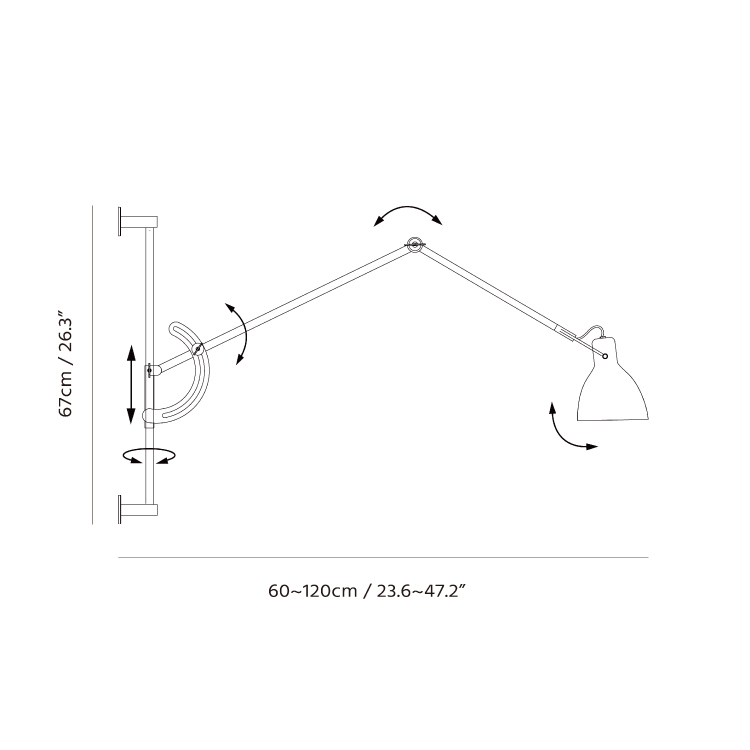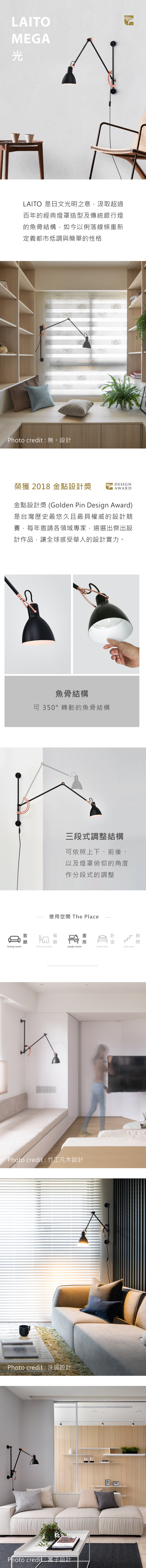 Laito 是日文的「light 光明」之意,燈罩是現代主義中超過百年的燈飾經典造型。Laito Mega 俐落的線條、霧面烤漆與局部銅色點綴,重新定義都市低調與簡單的性格。搭配圓規式的調整結構、可 350° 轉動的魚骨結構,適用於現代生活的複合式多元居家空間,同時也闡述對復古的眷戀。
