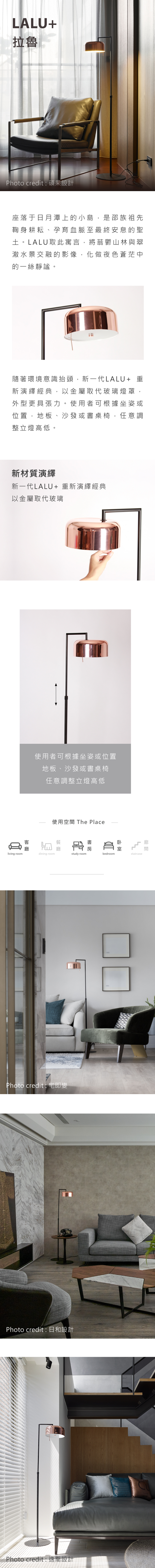 隨著環境意識抬頭,新一代LALU+ 重新演繹經典,以金屬取代玻璃燈罩,外型更具張力。使用者可根據坐姿或位置,地板、沙發或書桌椅,任意調整立燈高低。