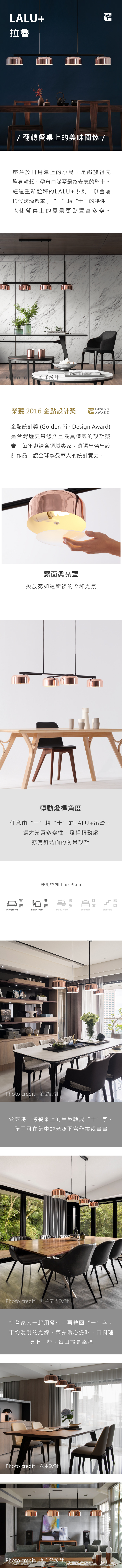 新一代LALU+ 重新演繹經典,以金屬取代玻璃,外型更具張力,功能亦有革新。使用者可依需求,由「一」 至「十」轉動燈桿角度,滿足用餐或工作等場域功能,燈罩下方的玻璃柔光罩,翻轉裊裊光氛於居家之中。