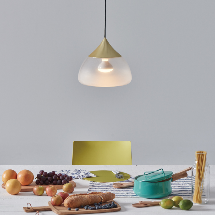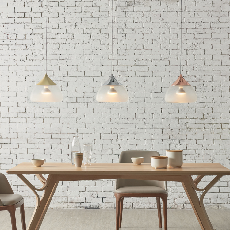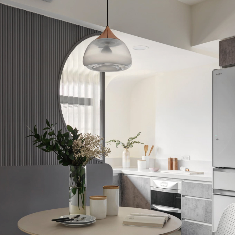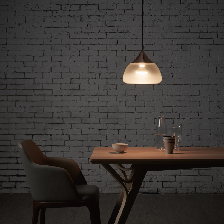 點綴空間盎然樣的MIST 吊燈,經由老師傅多年經驗操刀,將大片風景與玻璃交融。霧面噴砂處理,自底部雲湧而起,燈亮時的氤氳感,彷彿日出初醒的光絲,瀰漫於雲海間。