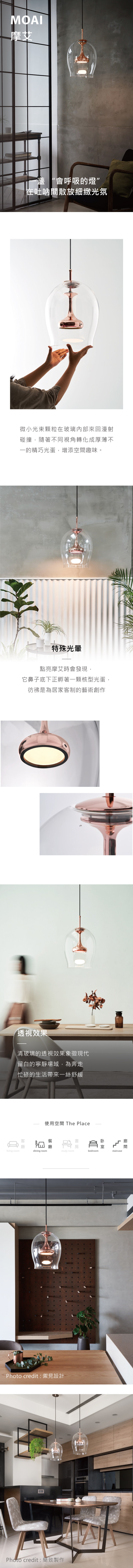 MOAI 靈感取自復活節島上的摩艾石像,設計師描其輪廓、結合清玻璃透視效果與金屬亮面質感,為現代人奔忙的生活步伐捎來一絲徐緩氣息。簡約剔透的外型能自在穿梭於現代留白的寧靜場域及瀰漫復古風味的人文空間;微小光束顆粒在玻璃內部來回漫射碰撞,隨著不同視角轉化成厚薄不一的精巧光蛋,增添空間趣味。