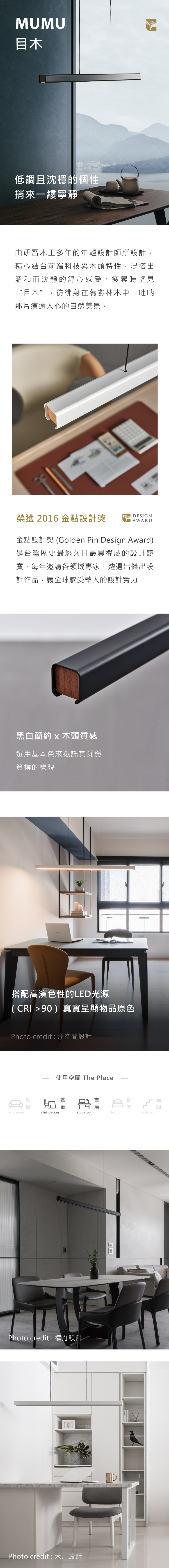 目木由年輕設計師 Dian 所設計,研習木工多年的他,精心結合前端科技與木頭特性,將高演色性(CRI>90)的LED光源嵌入流線俐落的金屬燈體,獨家的R角收邊與相合在燈體兩側的自然木紋,混搭出溫和而沈靜的舒心感受。疲累時望見「目木」,彷彿身在蓊鬱林木中,吐吶那片療癒人心的自然美景。