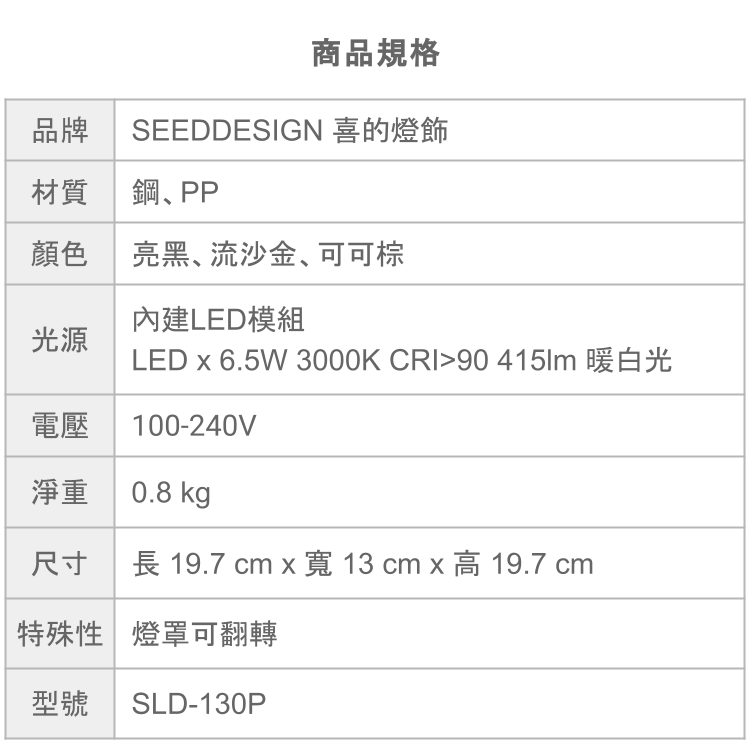 光源 LED x 6.5W 3000K CRI>90 415lm 暖白光