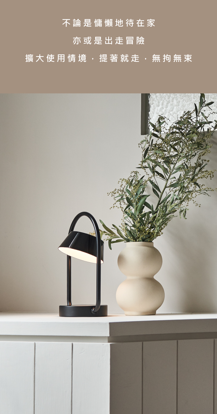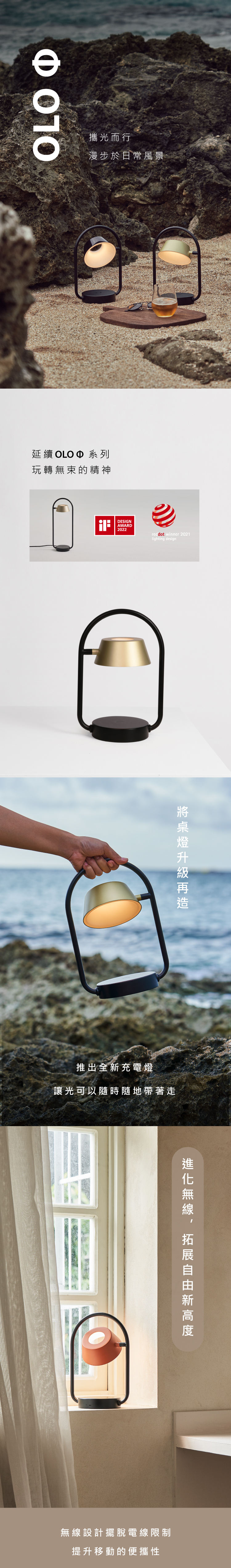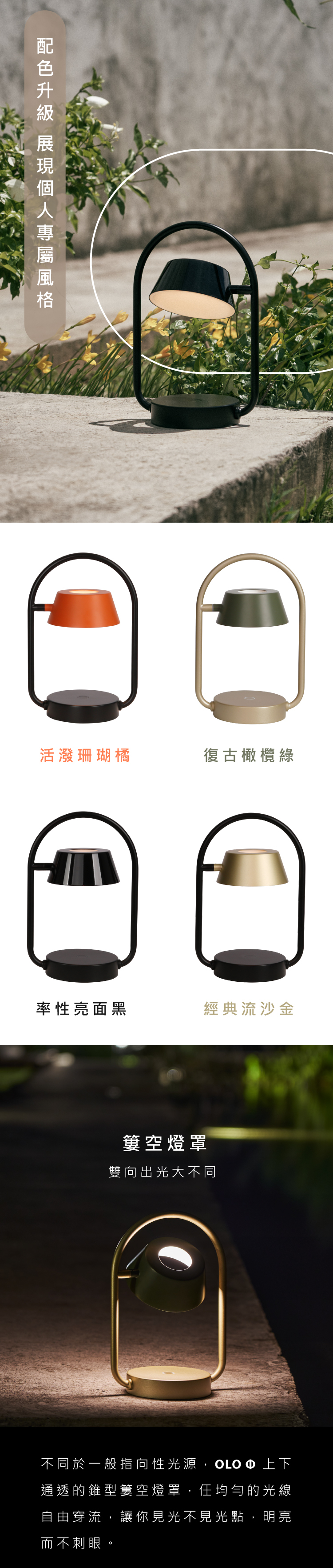 OLO Φ 秉懷初心,保有「經典錐形簍空燈罩」見光不見點的驚奇,延續290° 自由無束的翻轉趣味,這回更加靈活便攜,以全新充電燈的模樣升級再出發,迷人風采輕巧帶著走。可於室內任意添光常相伴,還能跟著逍遙外出踩點與探險,隨提隨行照亮生活的每一道精彩。