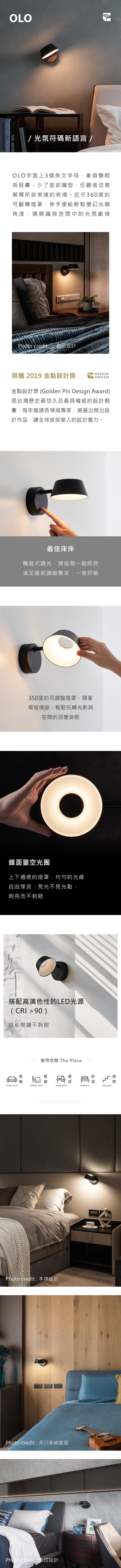 網路世代的蓬勃發展,演化出當代特有的符碼文化,OLO 揉合文字和新世代符碼概念,在光的領域注入一股文化新浪潮。三個英文字母,象徵雙眼與鼻子,少了底部嘴型,任觀者恣意解釋所欲傳達的表情。設計師將這份意念延伸至燈具,運用簡單的幾何構件,聯手塑造一個迷樣而簍空的留白境地。壁燈近乎 360 度轉動功能和觸控式調光,伸手便能輕鬆調整方向和亮度,人人化身場域導演,親自編排光氛與環境間的契合距離。