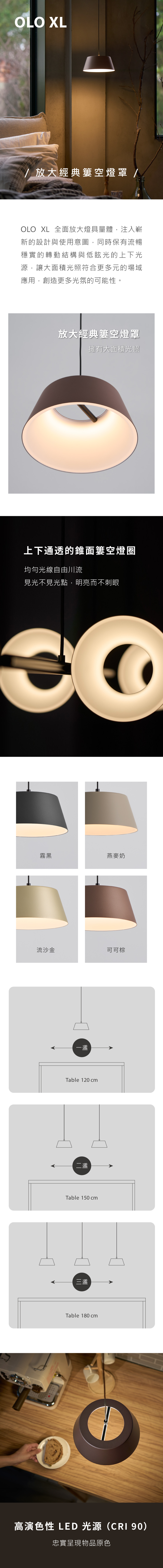外型極具標誌性的錐形簍空燈罩,秉持一貫的幾何線條,大方簡約中仍流露優雅餘韻。OLO XL 全面放大燈具量體,注入嶄新的設計與使用意圖,同時保有流暢穩實的轉動結構與低眩光的上下光源,讓大面積光照符合更多元的場域應用,創造更多光氛的可能性。