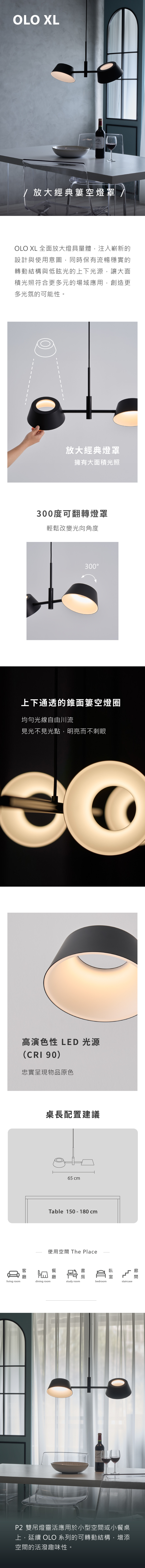 外型極具標誌性的錐形簍空燈罩,秉持一貫的幾何線條,大方簡約中仍流露優雅餘韻。OLO XL 全面放大燈具量體,注入嶄新的設計與使用意圖,同時保有流暢穩實的轉動結構與低眩光的上下光源,讓大面積光照符合更多元的場域應用,創造更多光氛的可能性。