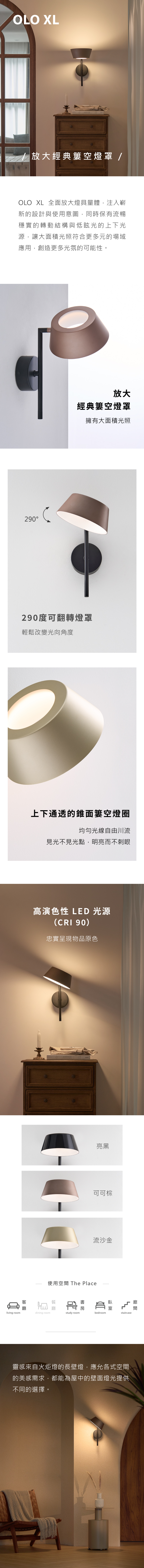 外型極具標誌性的錐形簍空燈罩,秉持一貫的幾何線條,大方簡約中仍流露優雅餘韻。OLO XL 全面放大燈具量體,注入嶄新的設計與使用意圖,同時保有流暢穩實的轉動結構與低眩光的上下光源,讓大面積光照符合更多元的場域應用,創造更多光氛的可能性。
