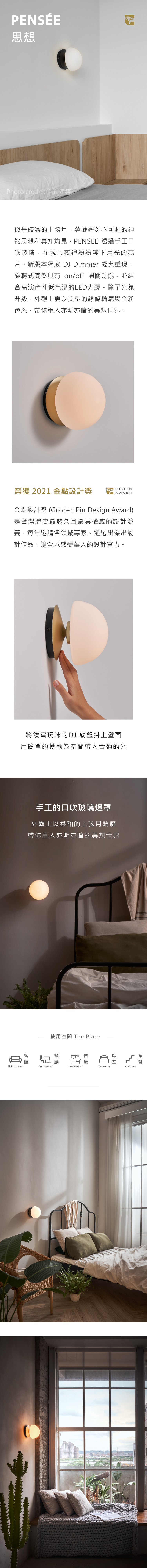 似是皎潔的上弦月,蘊藏著深不可測的神祕思想和真知灼見,PENSÉE 透過手工口吹玻璃,在城市夜裡紛紛灑下月光的亮片。新版本獨家 DJ Dimmer 經典重現,旋轉式底盤具有 on/off 開關功能,並結合高演色性低色溫的LED光源。除了光氛升級,外觀上更以美型的線條輪廓與全新色系,帶你重入亦明亦暗的異想世界。