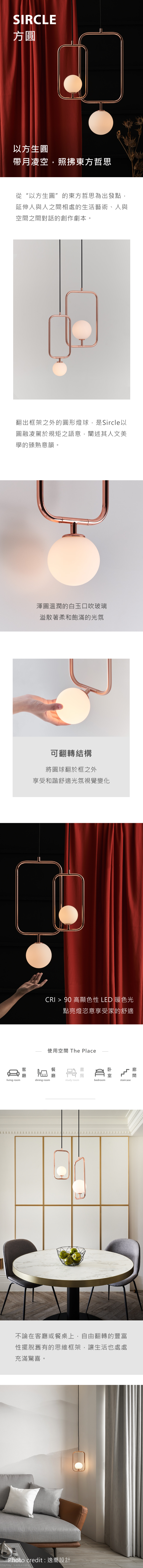 翻出框架之外的圓形燈球,是Sircle以圓融凌駕於規矩之語意,闡述其人文美學的臻熟意韻。平衡穩實的可翻轉結構,營造舒心和諧的視覺變化,透過渾圓溫潤的白玉玻璃,如呼之欲出的暖月光輝,灑溢遍地人情美好。
