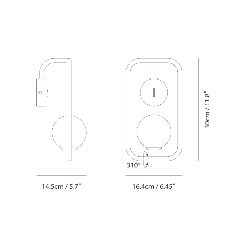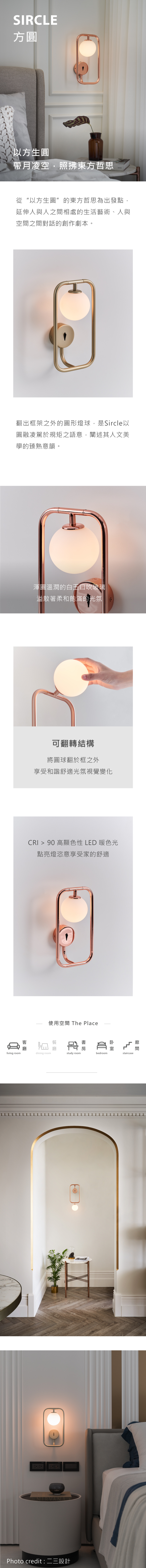 翻出框架之外的圓形燈球,是Sircle以圓融凌駕於規矩之語意,闡述其人文美學的臻熟意韻。平衡穩實的可翻轉結構,營造舒心和諧的視覺變化,透過渾圓溫潤的白玉玻璃,如呼之欲出的暖月光輝,灑溢遍地人情美好。