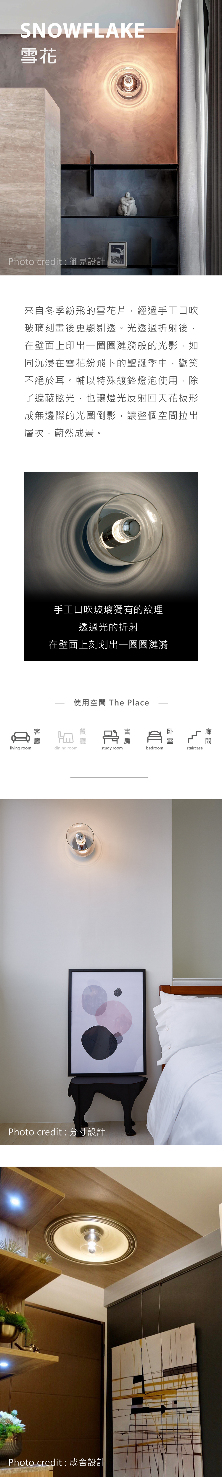 來自冬季紛飛的雪花片,經過手工口吹玻璃刻畫後更顯剔透。光透過折射後,在壁面上印出一圈圈漣漪般的光影,如同沉浸在雪花紛飛下的聖誕季中,歡笑不絕於耳。輔以特殊鍍鉻燈泡使用,除了遮蔽眩光,也讓燈光反射回天花板形成無邊際的光圈倒影,讓整個空間拉出層次,蔚然成景。