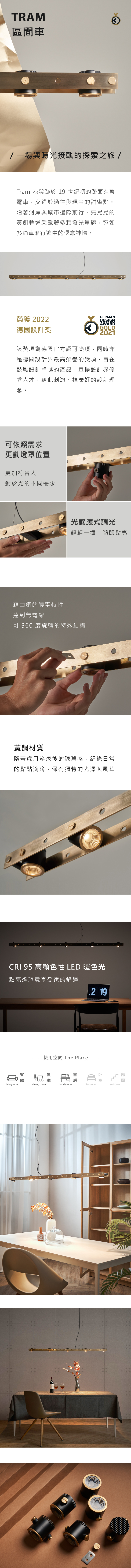 Tram 為發跡於19世紀初的路面有軌電車,交錯於過往與現今的甜蜜點。藉由銅的導電特性達到去電線化的意圖,360度的完轉結構於焉誕生,更可增加燈罩顆數創造多元光氛;紳士儀表下兼具 Optic sensor 和高演色性CRI95,光氛呈色自然調節有度,令人沉浸在意欲聚焦或遠眺的眷戀畫面。
