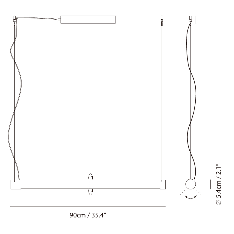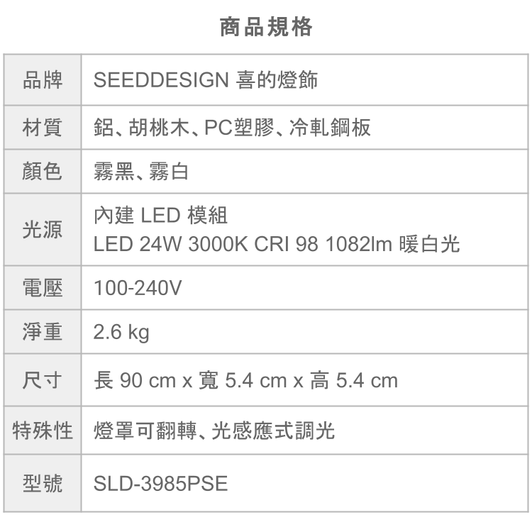 經典黑、白兩色,搭配兩端的胡桃木飾片,色彩溫潤淡雅,提供 90、120、150 cm三種燈長尺寸,適配各式空間場域。
