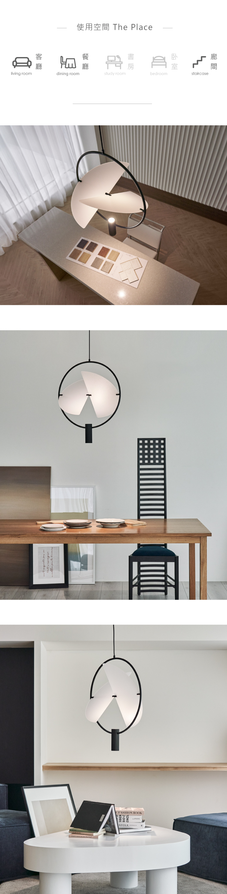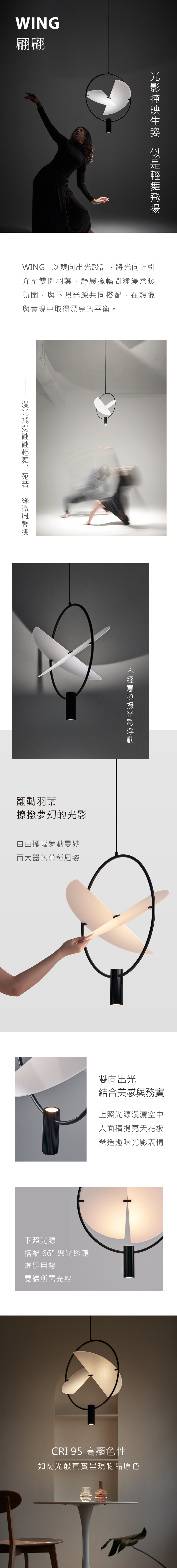 設計師結合對光線變化的細膩觀察和創意思考,賦予 WING 精巧的「雙向出光」:將光向上引介至半透光的雙開羽葉,舒展擺幅舞動風姿,讓空間瀰漫輕盈柔暖的氛圍;下照光源配有 66° 月暈透鏡,光線充足而不眩目,滿足日常光照的務實需求。微妙的設計思量膽大卻不妄為,光影交織間自然流露動態美感,在想像與實現中取得漂亮的平衡。