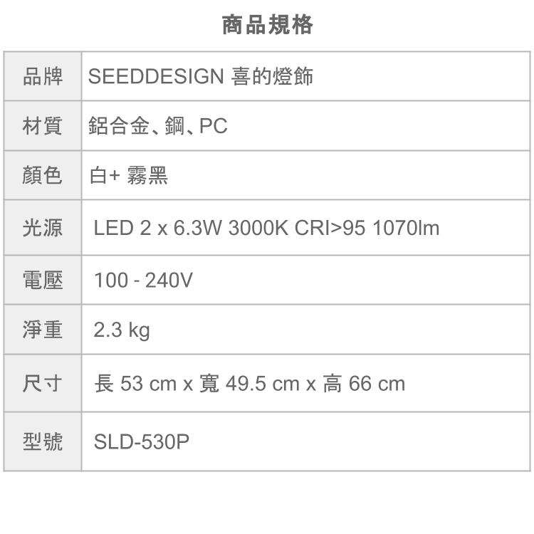 光源 LED 2 x 6.3W CRI>95 1070lm 3000K 暖白光